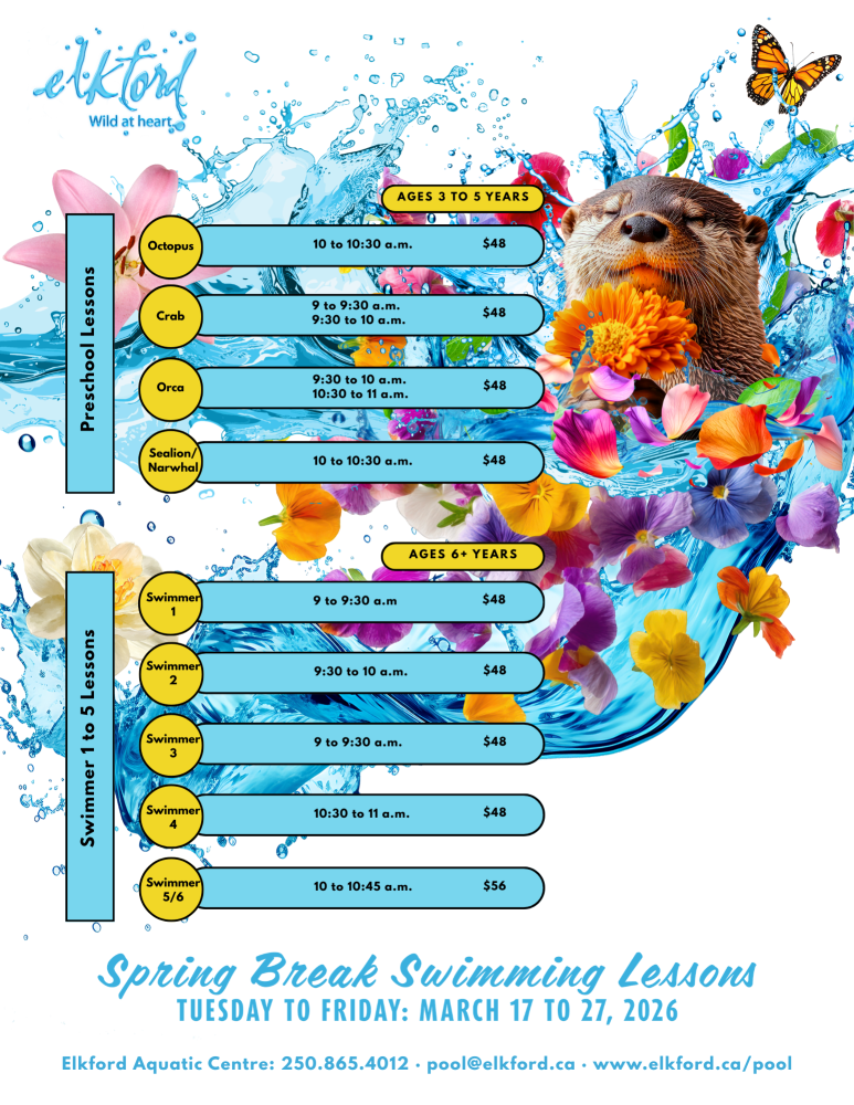 For more information, or to register, contact the Aquatic Centre at 250.865.4012 or pool@elkford.ca.